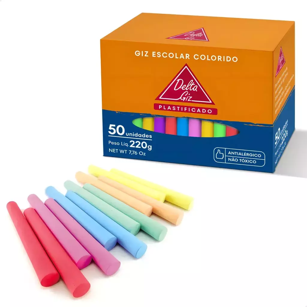 O Giz Colorido Escolar Plastificado Delta é perfeito para trazer mais vida e destaque às aulas e atividades criativas. Sua película plástica evita sujeira nas mãos e reduz o pó, garantindo conforto e segurança no uso. Resistente e antialérgico, proporciona cores vivas e uma escrita uniforme em lousas, murais e trabalhos artísticos.